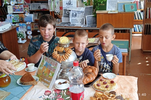 К мероприятию для читателей и гостей в библиотеке был оформлен стол с угощениями, подготовлена красочная выставка-поздравление под названием «Медовый Спас».