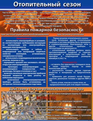 Перед началом отопительного сезона печи и дымоходы должны быть проверены, очищены от сажи и отремонтированы. Некоторые правила: Не оставлять топящиеся печи без присмотра, не поручать надзор за ними малолетним детям. Не применять для розжига печей горючие и легковоспламеняющиеся жидкости. На деревянном полу перед топкой необходимо прибить металлический (предтопочный) лист размером не менее 50×70 см. Чтобы не допускать перекала печи, рекомендуется топить её 2–3 раза в день и не более чем по полтора часа, за 3 часа до отхода ко сну топка печи должна быть прекращена.