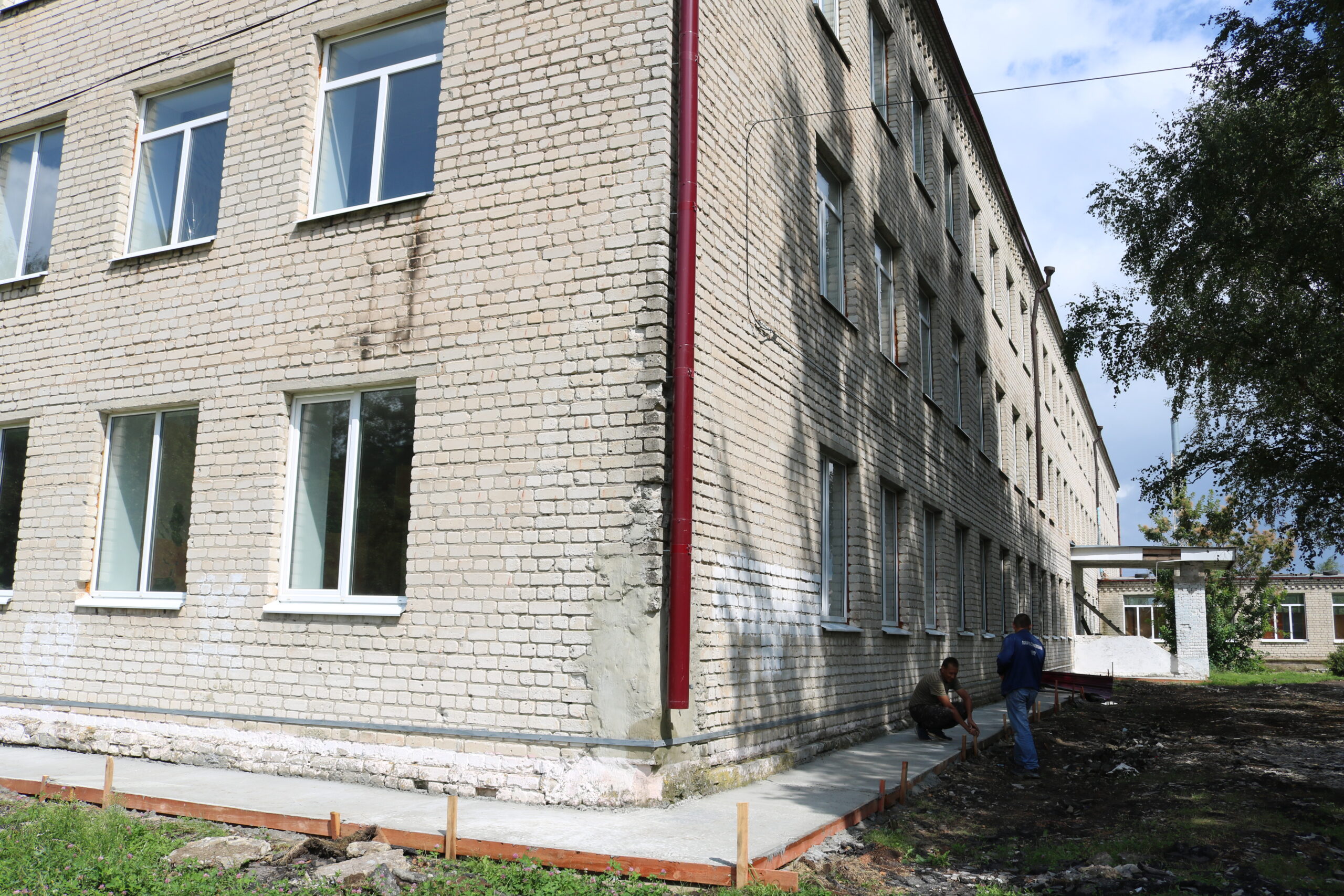 Снаружи здания также ведутся важные работы: завершено устройство отмостки, усиленной армирующей проволокой, и вывезен строительный мусор.